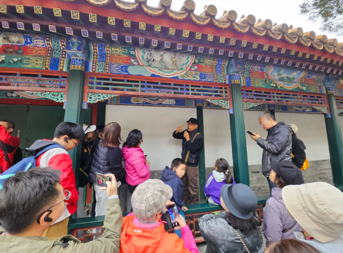 《颐和园长廊彩画故事全集》作者易明老师担任主讲。会员们跟随着易明老师游览了颐和园长廊、佛香阁以及谐趣园,了解了颐和园彩画艺术的整体特色与文化内涵,通过精要的赏析引导,帮助大家建立起对这项传统艺术的整体认知。尽管深秋时节寒意渐浓,但会员们始终保持着高涨的学习热情,在漫步中细细品味这座艺术长廊的独特魅力。